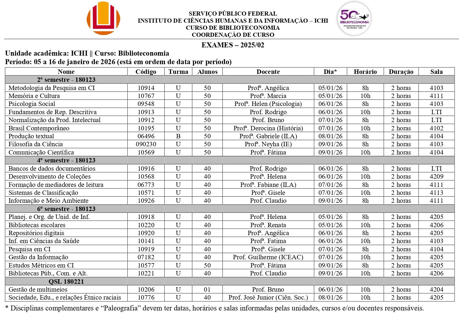 A coordenação divulga as datas e horários dos exames do 2º semestre de 2025, confira abaixo ou clique aqui.