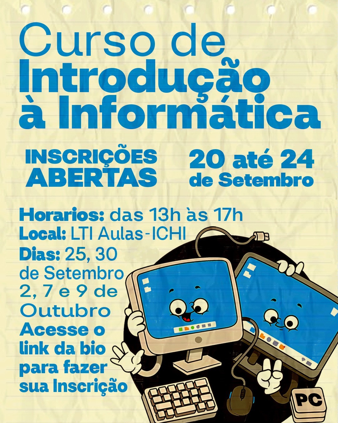 O Instituto de Ciências Humanas e da Informação (ICHI/FURG) convida a comunidade acadêmica para participar do Curso de Introdução à Informática, voltado a quem deseja fortalecer seus conhecimentos em informática básica e desenvolver maior autonomia no uso das tecnologias digitais.