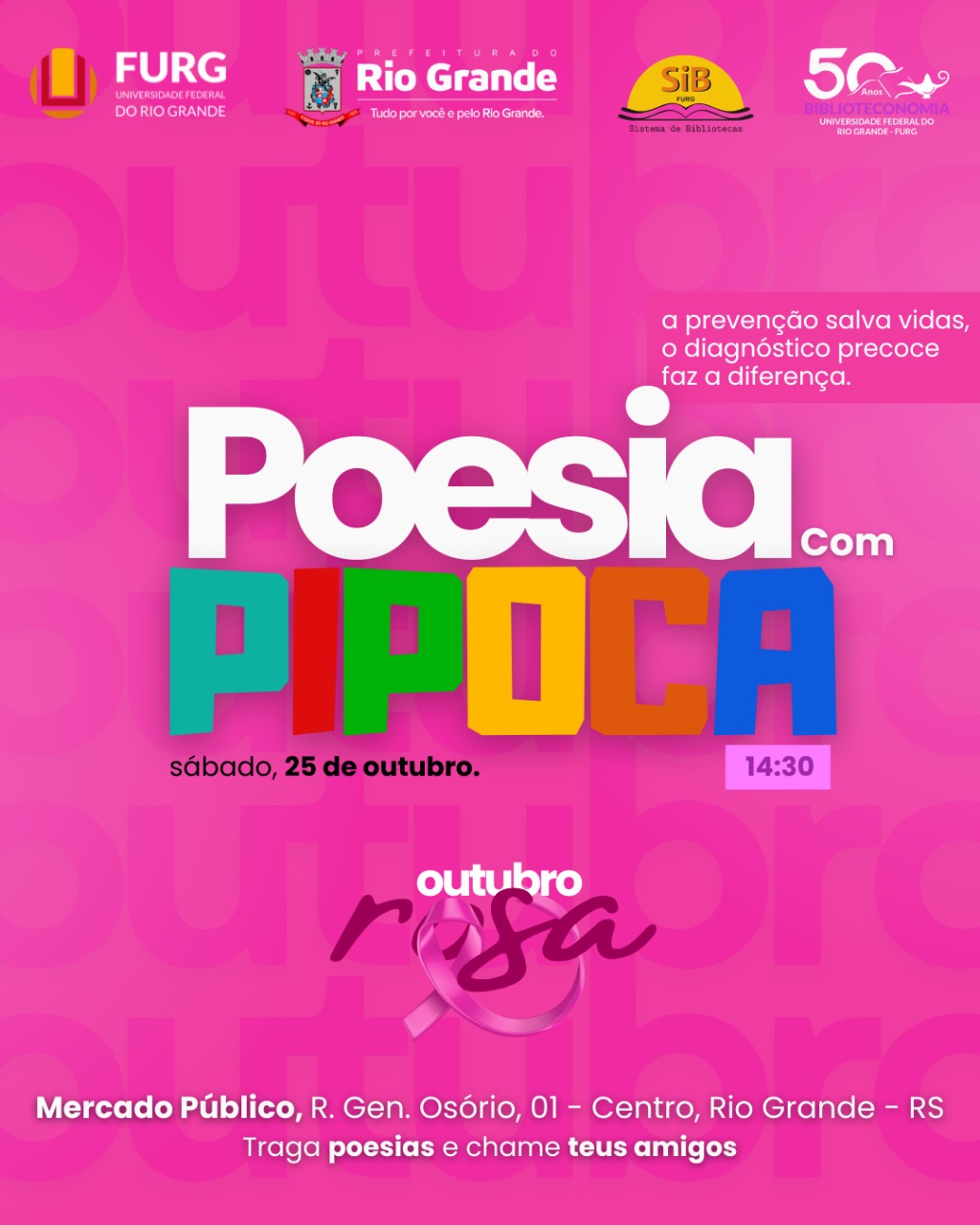 O projeto de extensão "Poesia com Pipoca" tem o prazer de anunciar sua próxima edição, que ocorrerá no sábado, dia 25 de outubro, às 14h30. Desta vez, o evento traz uma temática especial, unindo a arte e a conscientização: o Outubro Rosa. A iniciativa tem como objetivo principal chamar a atenção para a importância da prevenção e do diagnóstico precoce do câncer de mama.